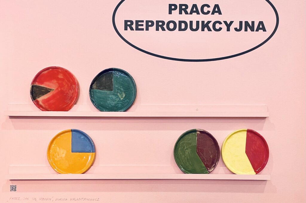 ’Care’, understood on the one hand as unpaid work performed by women, and on the other as a system of soft control that creates the appearance of a relationship based on mutual dependence and gratitude, is one of the key concepts behind the series of handmade ceramic plates titled 'Watch Me Work’. The series addresses the time poverty fuelled by capitalism and the employment system, which ultimately limits the career and personal choices of many women. Using the aesthetic of statistical charts, it illustrates the relationship between work and gender in various fields.